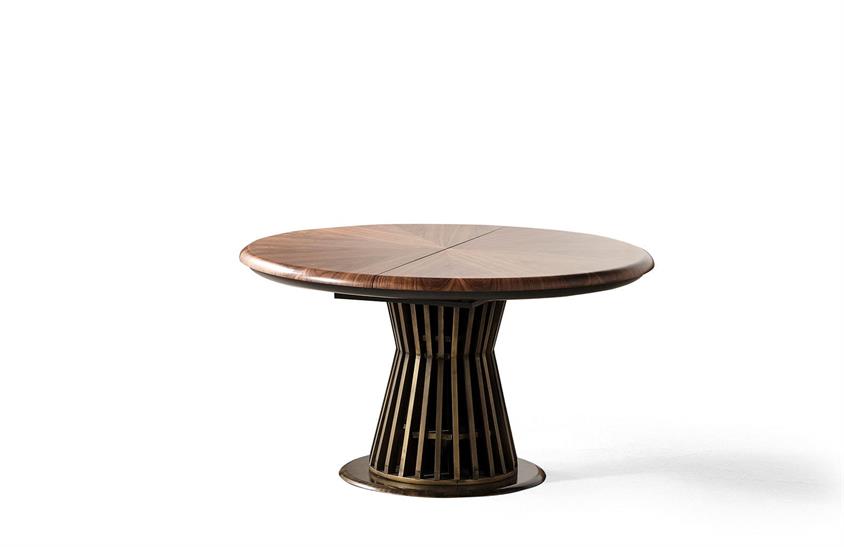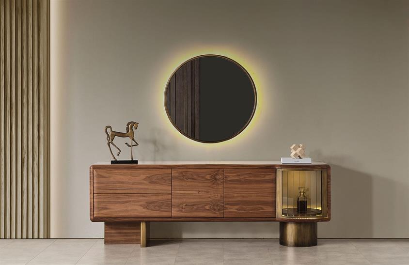 Aviles Yemek Odası Takımı, ceviz renginin sıcaklığı ve eskitme gold detayların şıklığıyla evlerinize sofistike bir hava katıyor. Modern çizgileriyle öne çıkan tasarım, hem klasik hem de modern tarzlara uyum sağlayabiliyor. Açılır yuvarlak masa olması sayesinde, hem küçük hem de büyük mekanlarda kullanışlı bir çözüm sunuyor.