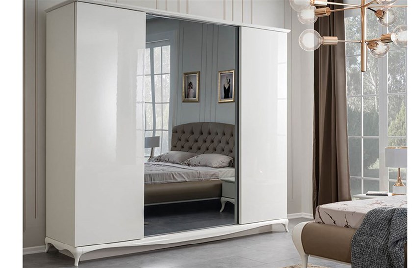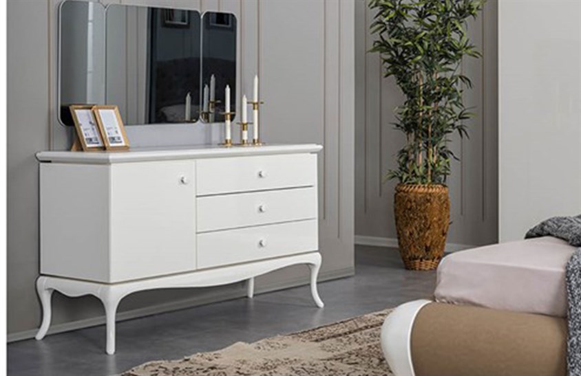 Barok yatak odası takımı ekru, yerden yüksek ayakları ve sürgülü dolabın genişliği ile uzun yıllar odanızı kullanışlı bir hale getirecek.