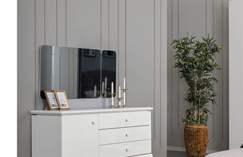 Yatak odası takımının içeriğinde dolap, şifonyer, karyola, ayna ve 2 adet komodin bulunmaktadır. Standart kombinasyonu dışında farklı kombinasyonlarla sipariş alınmaktadır. Ürün içeriğinde yaylı yatak yoktur ancak ayrıca satın alabilirsiniz. Takımın ön yüzleri ve yanları mdf, iç kısımları ve arkası yonga levhadır. Odanızın genişliğine göre özel ölçü siparişi verebilirsiniz. Takıma dahil olan yatak başlığının rengi ise yine isteğiniz doğrultusunda değiştirilebilir.