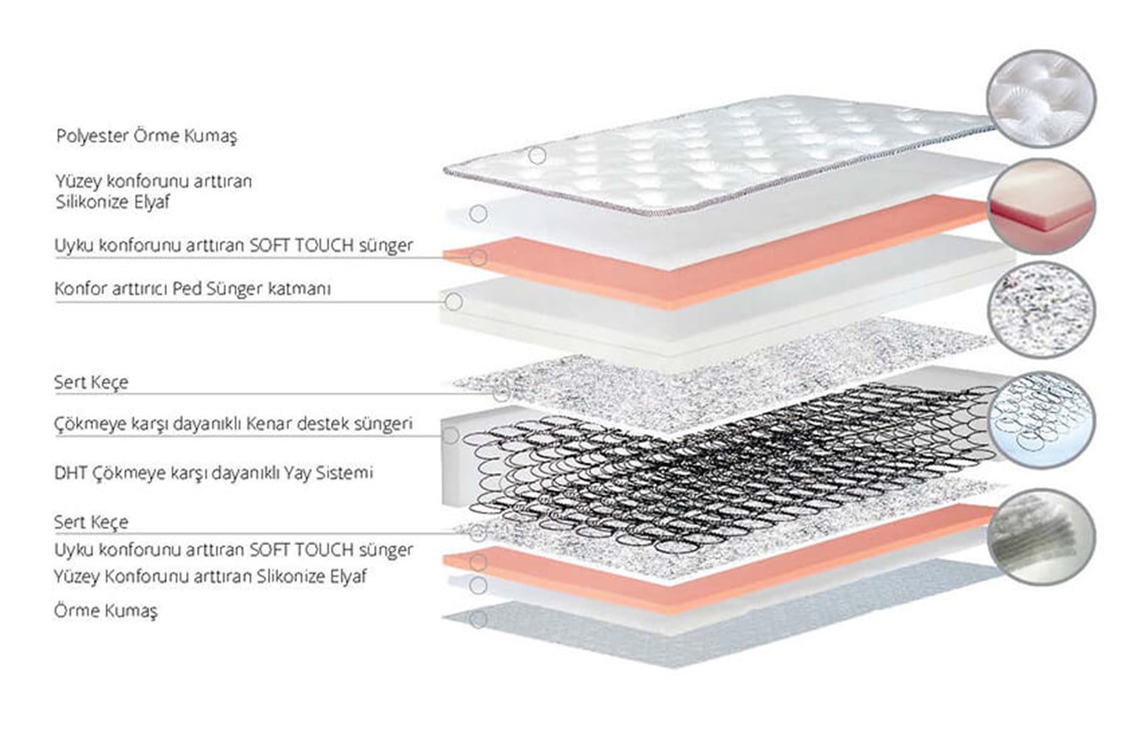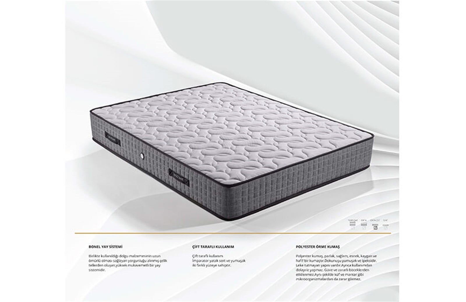 Yatak Tipi: Full Ortopedik Yatak .Yatak Yüksekliği: 27 cm .Yay Tipi: Bonnell Yay (Kafa çapı: 86mm, Tel kalınlığı: 2.2mm) Sünger Malzemesi: Muhtelif yoğunluklu sünger katmanlar. Basınç Dengeleyici Özelliği: Var Antialerjik Özelliği: Var. Antibakteriyel Özelliği: Var. Çift Taraflı Kullanım: Var, sert ve yumuşak iki farklı taraf. Üst Yüzey Malzemesi: Terletmez, polyester örme kumaş. Sertlik Derecesi: Orta. Üst Ambalaj: 20 mikron kalınlığında plastik ambalaj. Köşe kartonları ile desteklenmiştir. Deforme olmaması için presleme ve rulo (roll-pack) yapılmamıştır.