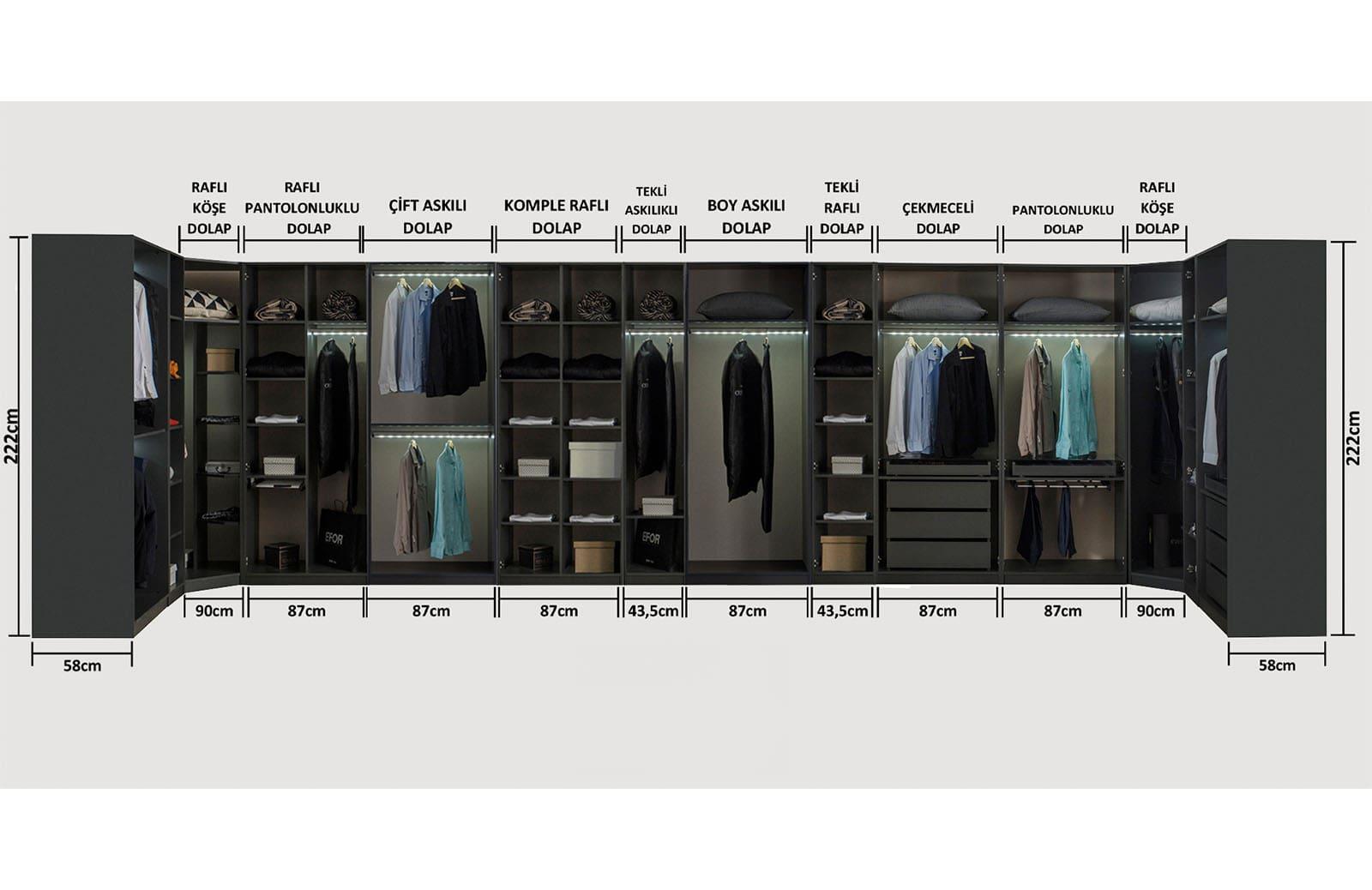 Yatak odası ve giyinme odasında kullanılabilecek en iyi tasarımlardan biri olan Daisi köşe dolap takımı antrasit, fonksiyonel özellikleri sayesinde yoğun ilgi görmektedir. Fazla kıyafetlerinizi rahatça yerleştirebileceğiniz Daisi köşe dolap takımı antrasit, geniş bir kullanım alanı sunar. İki kapaklı çekmeceli dolap, iki kapaklı pantolonluklu dolap, iki kapaklı raflı pantolonluklu dolap, raflı köşe dolap ve tek raflı dolap ile zengin bir takıma sahiptir. Aradığınız tüm özellikleri bulabileceğiniz köşe dolap; günlük kıyafet, pantolon, gömlek, ceket ve elbiseleriniz için özel bölmelerden oluşur. Bu ürün ile kıyafetlerinizi tarzına göre ayırabilir, düzenli bir şekilde muhafa edebilirsiniz. Daisi köşe dolap hem kalite standartlarına uygun şekilde üretilir hem de tarzı ile modern bir giyinme alanına sahip olmanızı sağlar. Üründe birinci sınıf yonga levha kullanılmaktadır. Sağlığa ve çevreye zararlı hiçbir madde yer almaz ve kanserojen madde içermez. Dolabın kapaklı oluşu sayesinde kolay bir kullanım sunan takım, farklı kombinasyonlar ile tercih edilebilir. Dolabın modüler parçalarını giyinme odanıza veya yatak odanıza uygun şekilde arttırabilir veya azaltabilirsiniz. Daisi köşe dolap takımı antrasit, kalitesi ve tarzı ile son zamanların en dikkat çekici mobilyaları arasına girmeyi başarmıştır. Bu özel tasarımın sunduğu kolaylıklardan yararlanmak için acele edin ve kendinize ait bir giyinme odasının rahatlığını yaşayın.