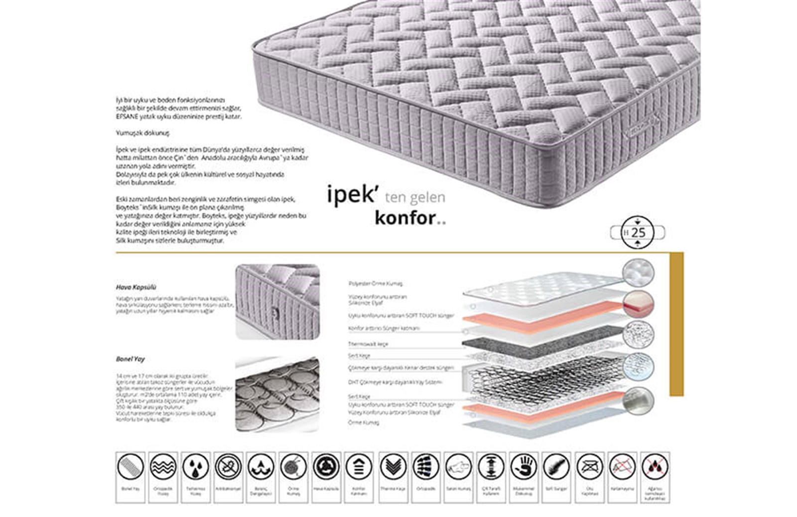 Yatak Tipi: Full Ortopedik Yatak. Yatak Yüksekliği: 25 cm .Yay Tipi: Bonnell Yay (Kafa çapı: 86mm, Tel kalınlığı: 2.2mm) Sünger Malzemesi: Muhtelif yoğunluklu sünger katmanlar. Basınç Dengeleyici Özelliği: Var Antialerjik Özelliği: Var. Antibakteriyel Özelliği: Var. Çift Taraflı Kullanım: Var. Üst Yüzey Malzemesi: Terletmez, polyester örme kumaş Sertlik Derecesi: Sert Ambalaj: 20 mikron kalınlığında plastik ambalaj. Köşe kartonları ile desteklenmiştir. Deforme olmaması için presleme ve rulo (roll-pack) yapılmamıştır. "