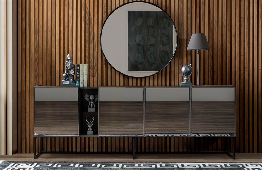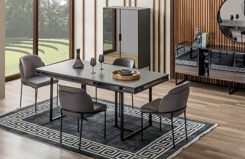 Evinizin en güzel köşesinde yemek saatlerinizi keyifli hale getireceğiniz Flora yemek odası takımı, antrasit renginin şıklığıyla tasarlanmıştır. Yemek odası takımının içeriğinde konsol, masa ve 6 adet sandalye bulunmaktadır. Konsol kapakları aynalı olarak üretilmiştir ve kapaklarında yavaşlatıcı menteşe kullanılmıştır. Böylelikle kapakların uzun ömürlü olması hedeflenmiştir. Yemek odası takımının hem masası hem de sandalyesi konforunuz düşünülerek birinci kalite malzemelerden üretilmiştir. Flora yemek odası takımını standart kombinasyonda satın alabileceğiniz gibi farklı kombinasyonlarda da sipariş verebilir ve bu şık takıma sahip olabilirsiniz.