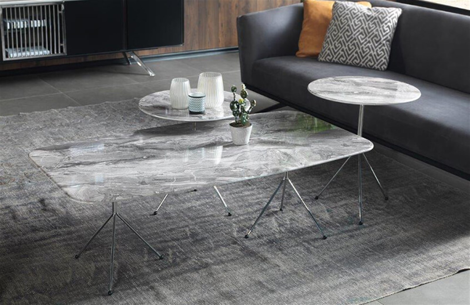 Ürünün üst kısmında çizilmeye karşı dirençli İtalyan marka SİRCA parlak vernik kullanılmaktadır. Üst tabla malzemesi 1. sınıf kalite 18mm MDF olup CNC işlem yapılmıştır. Ayaklar dolu mil malzemenin krom kaplanması ile imal edilmiştir. Ayaklar cıvata somun sistemiyle bağlandığı için ayakların yerinden kopma/çıkma gibi bir durum söz konusu olmayacaktır. Üst tablada mermer desen dijital baskı uygulanmıştır