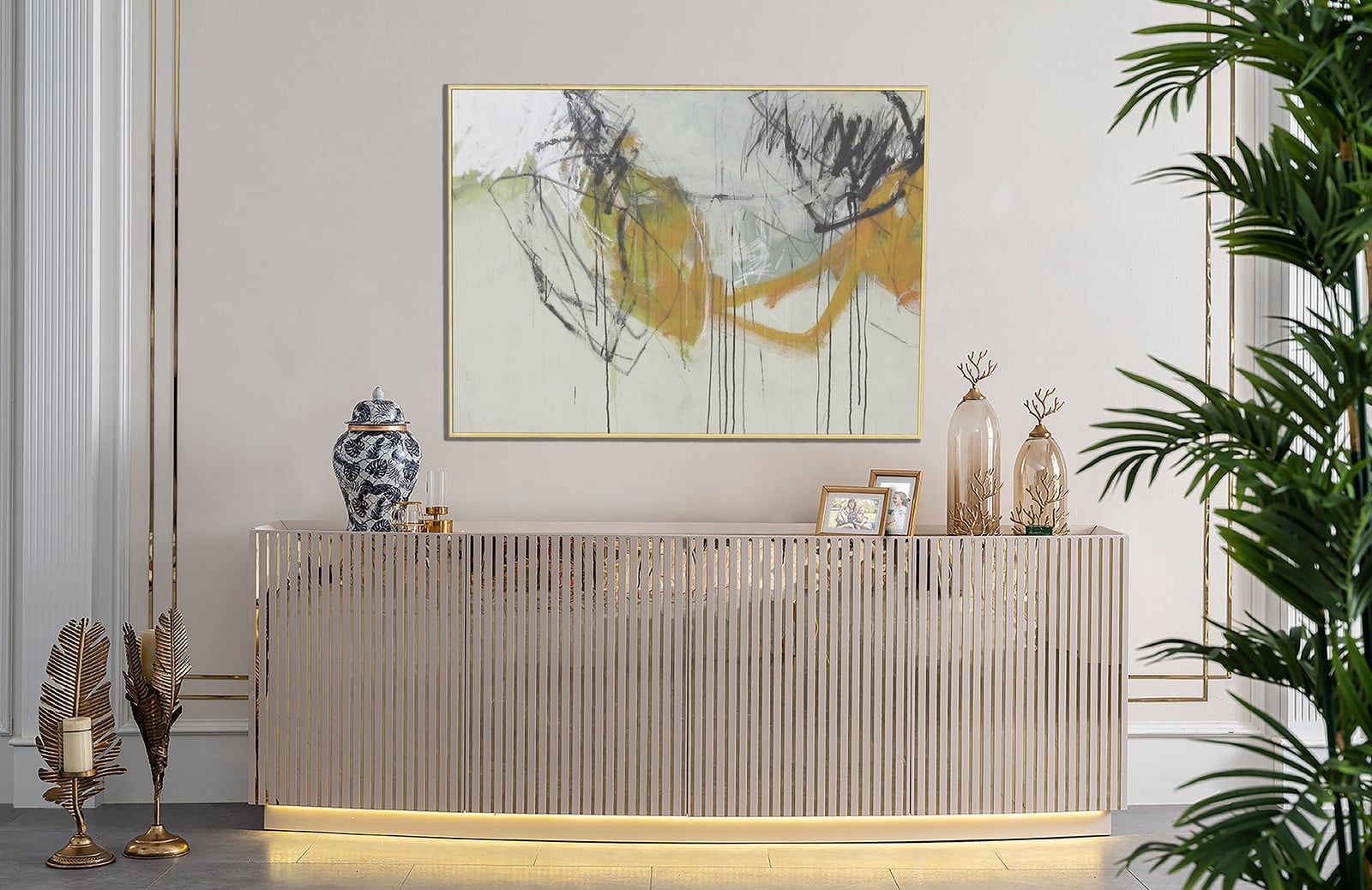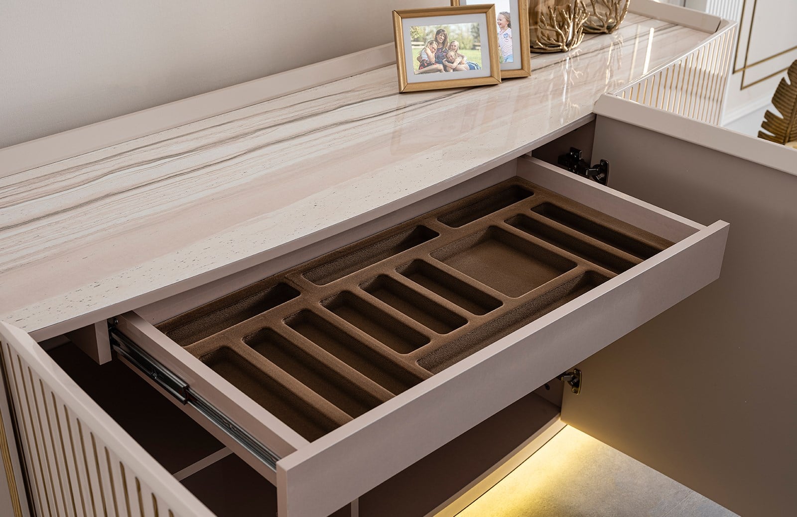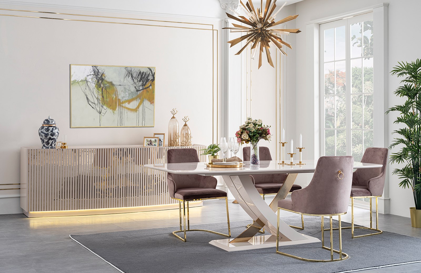 Şık ve çekici Glorya Yemek Odası Takımı; konsol, sandalye ve yemek masası ile fonksiyonel bir kullanım sunuyor. Izgara görünümlü dış tasarımı ile modern şıklığı sunan konsol, bölmeli yapısıyla da yemek takımlarını yerleştirmeniz için ideal alanlar sağlıyor. Konsolun üzerini dekoratif objeler ile süsleyerek ortama bambaşka bir hava katabilirsiniz. İç içe geçmiş sıra dışı ayak tasarımı ile dikkat çeken yemek masası beyazın sade şıklığını taşıyor. Glorya Yemek Odası Takımı uygun fiyatlarla Engince Mobilya’da.