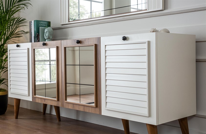 Geniş fonksiyonel özelliklerle zenginleştirilen James yemek odası takımı sayesinde tüm yemeklerinize anlam katın. James yemek odası takımı, zengin bir içerik ile sizlere sunulur. Konsol, konsol aynası, masa ve 6 adet sandalyesi, kalabalık misafir yemeklerinde beğenileri üzerine toplayacak. Ürünün açılır masası, geniş bir kullanım sunmaktadır. Kapaklı bölmelerinde yemek takımlarınızı gönül rahatlığı ile muhafaza edebilirsiniz. Ayrıca konsolun üst yüzeyi, minimal aksesuarlarınız için gerekli alanı sizlere sunacaktır. Yemek masasının tüm kapakları, yavaşlatıcı mekanizma ile desteklenerek uzun yıllar dayanıklı duruma getirilmiştir. Beyaz renge ceviz tonlarının eşlik ettiği James yemek odası takımı, kalite standartlarına uygun üretimi ile evinizi uzun yıllar renklendirecek özel bir mobilyadır.