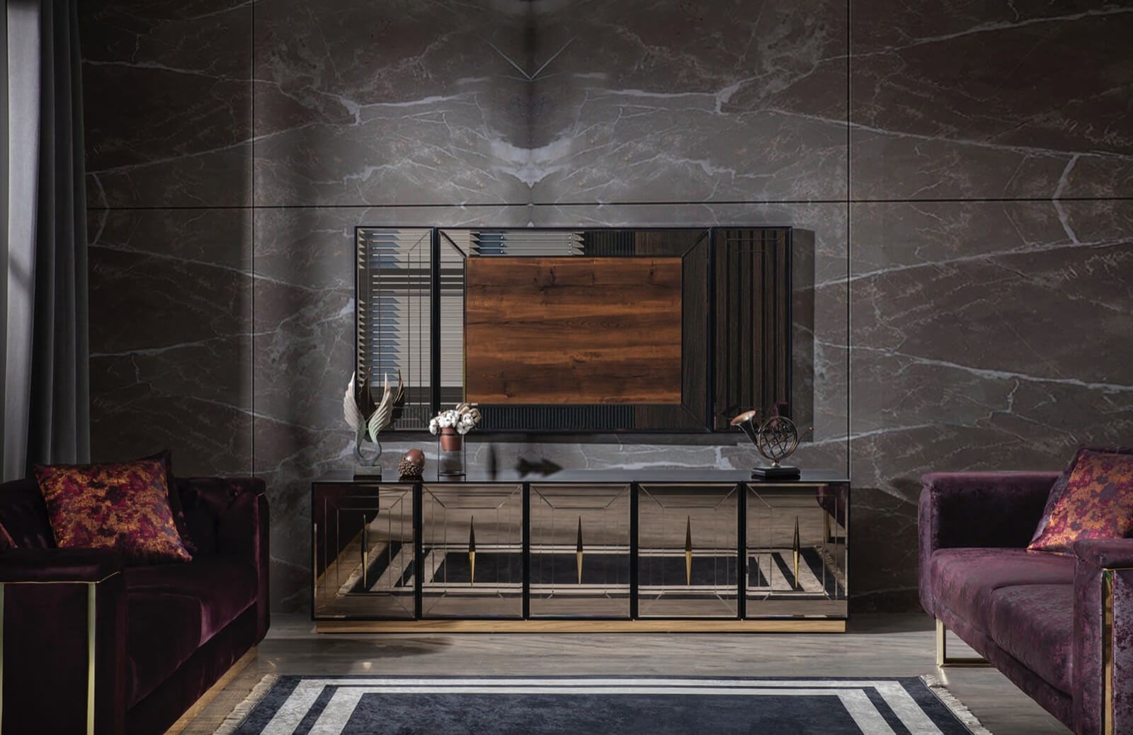 Ürünün tamamı yonga levhadır. Bronz aynalı bir üründür. Takım olarak alabileceğiniz gibi parça parça da alabilirsiniz. Ürün evinize demonte şeklinde gelir ve evinizde monte edilir.