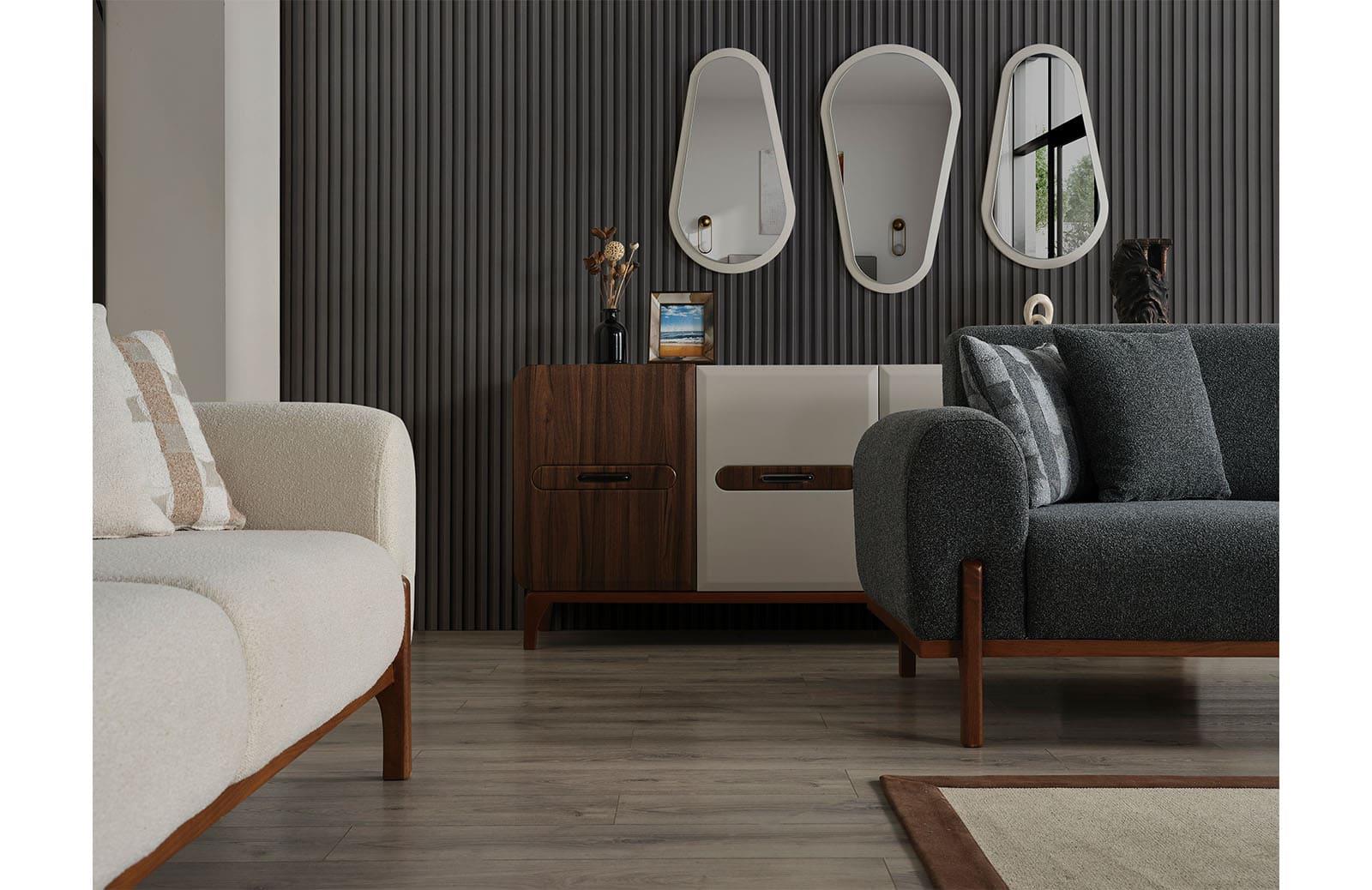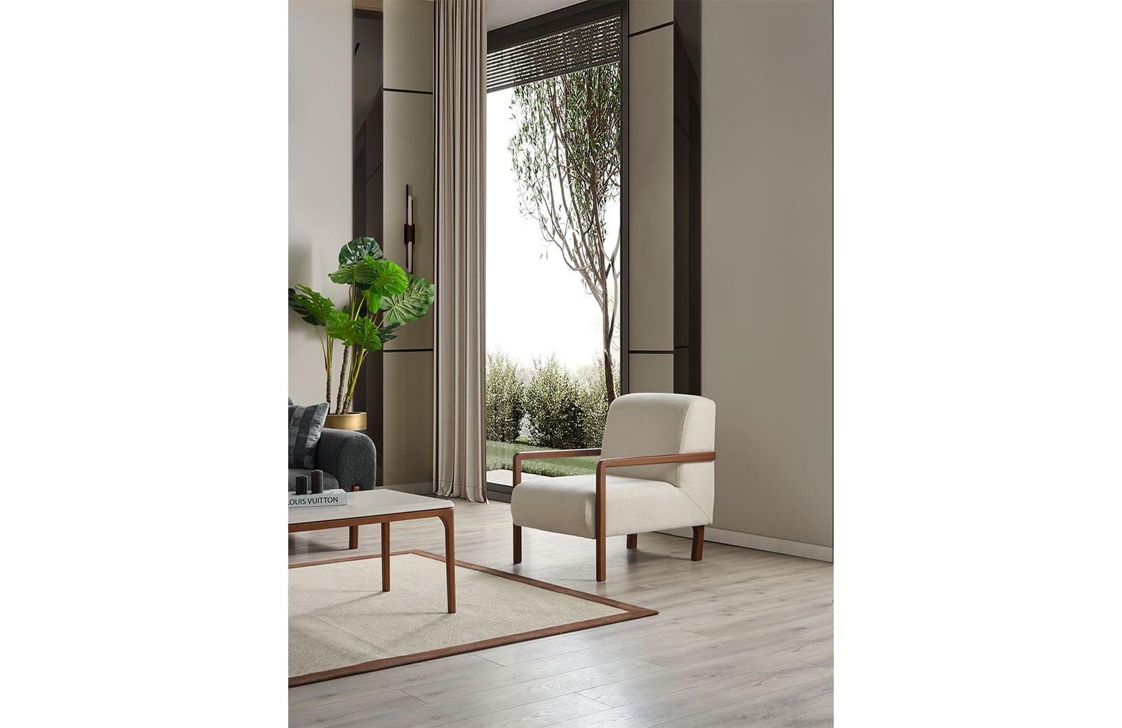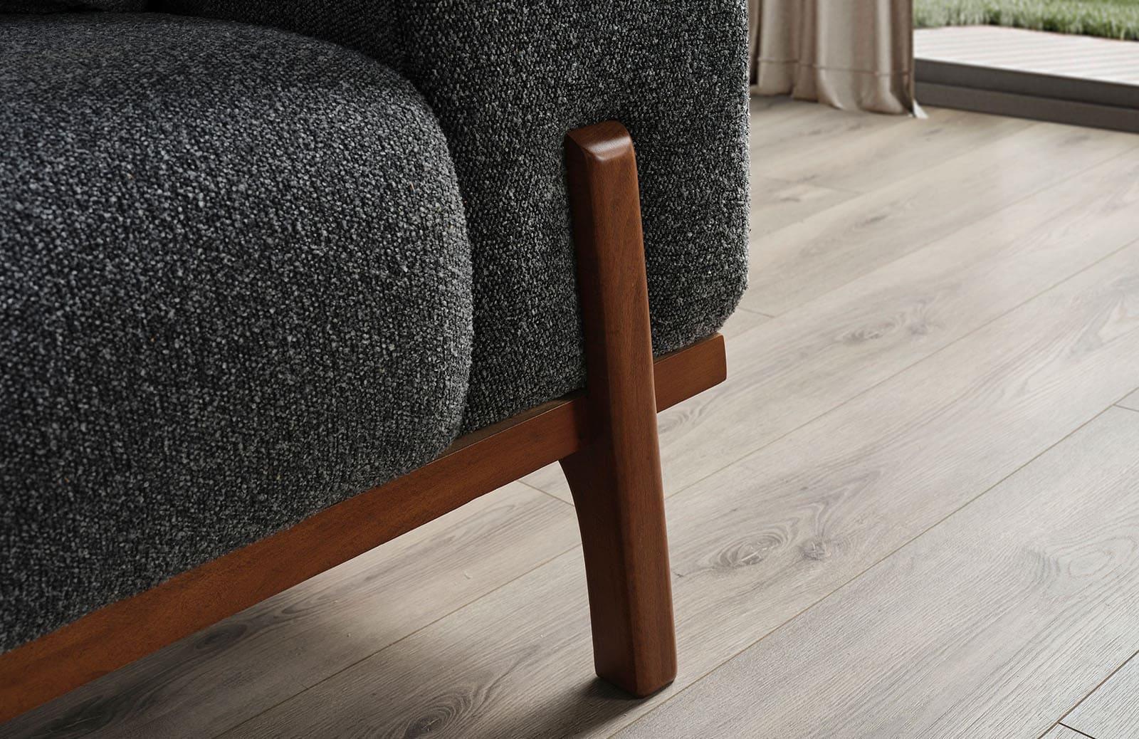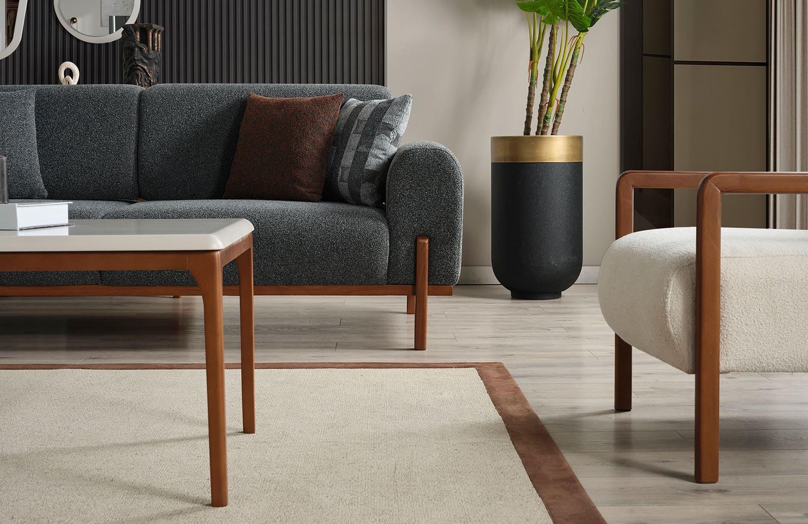 Kırlent dahil olan bu takım, gürgen ağacı malzemesi ile dayanıklıdır. Ayak rengi ve tipi ise isteğe göre değiştirilebilir, böylece dekorasyonunuza uyum sağlar.