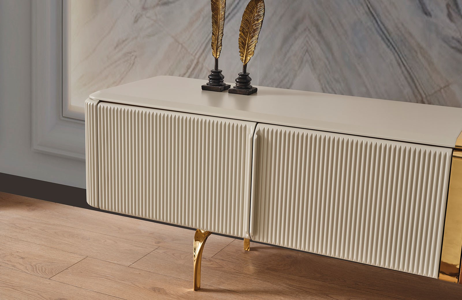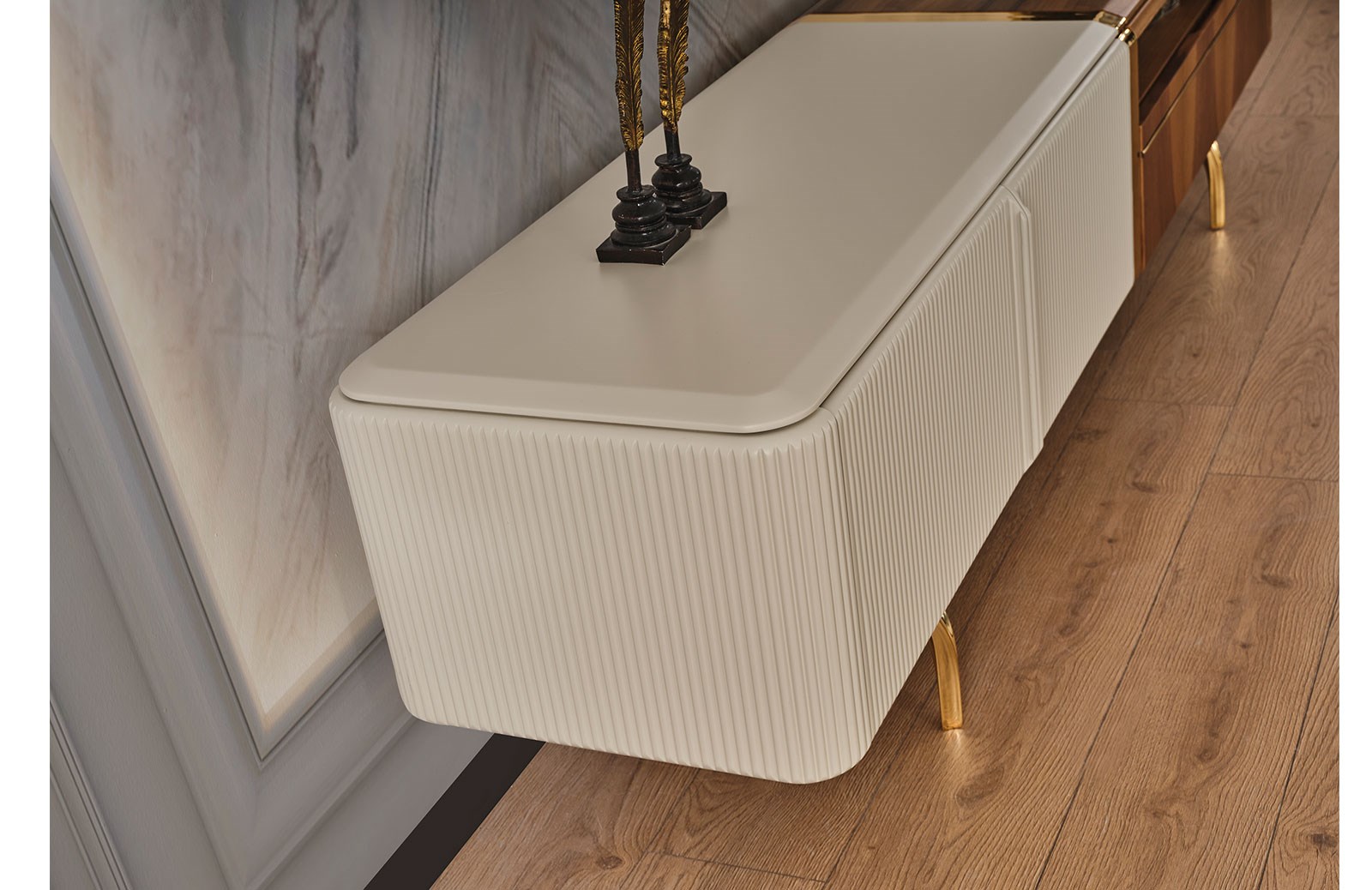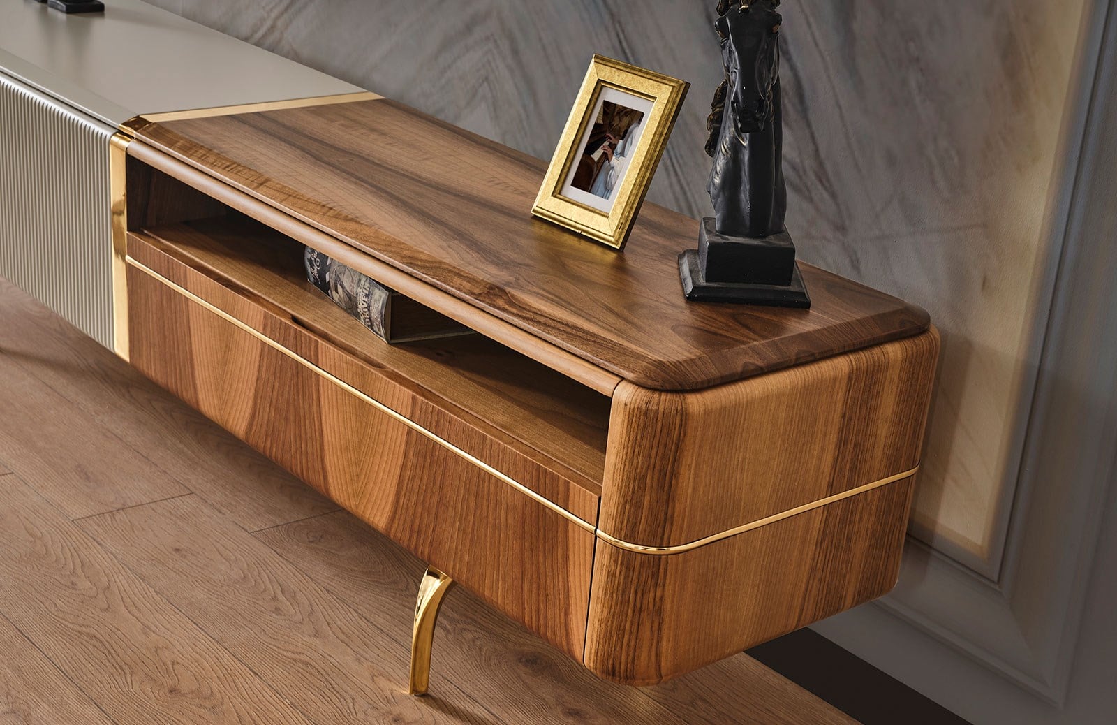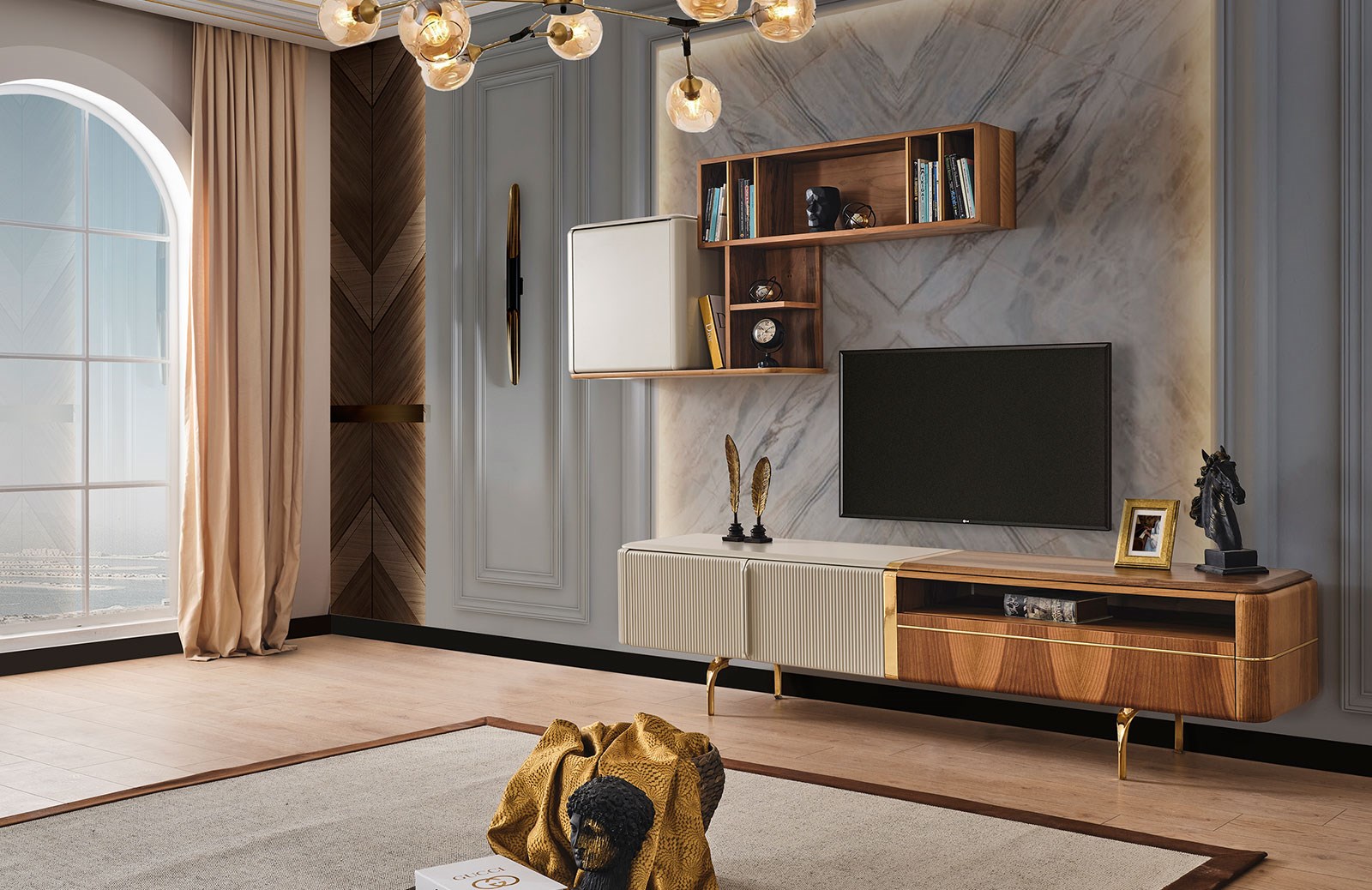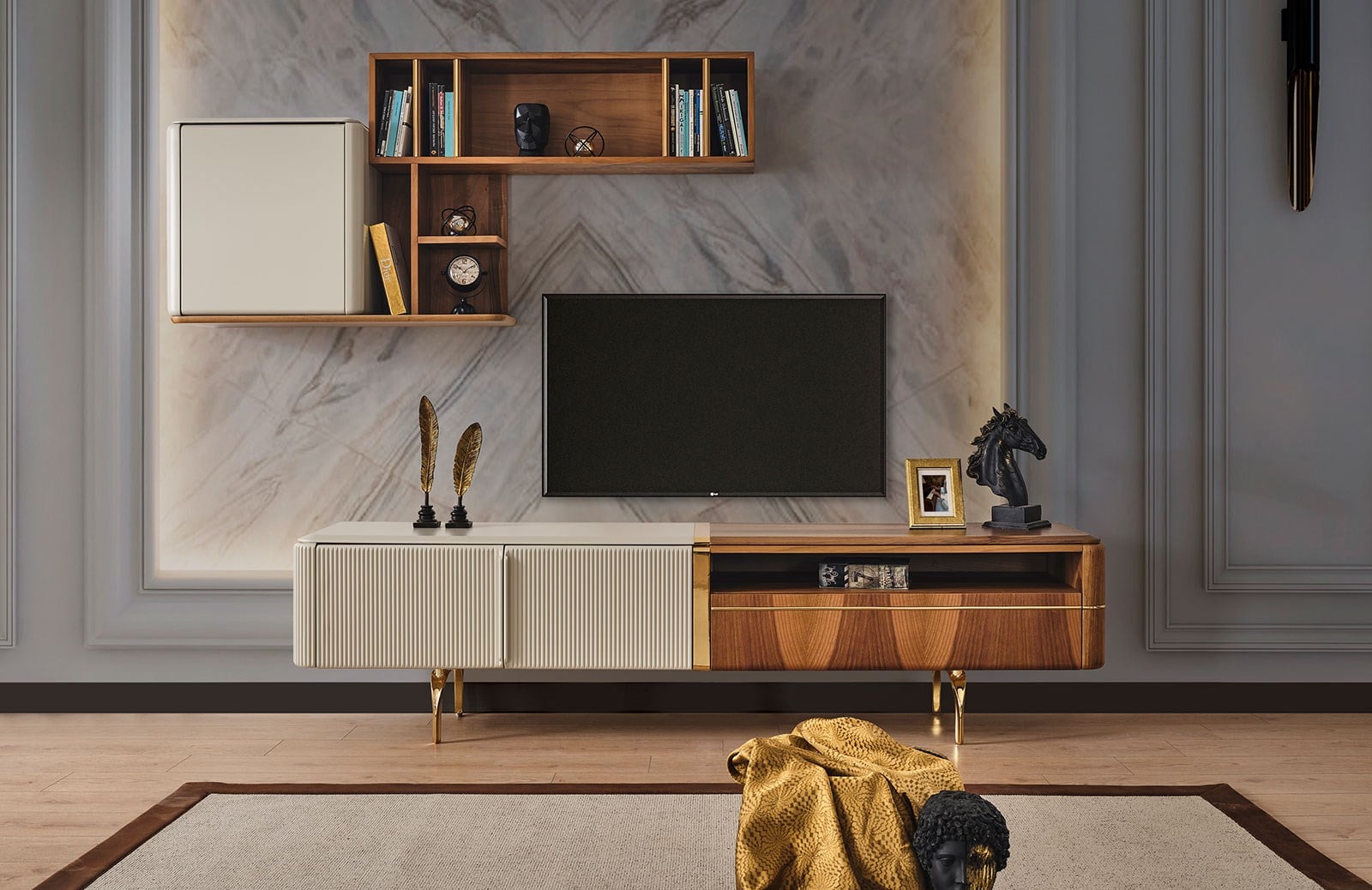 Hem aksesuarlarınız hem de muhafaza etmek istediğiniz eşyalarınıza geniş bir alan sunan Lizzy tv ünitesi, özel ölçülerde sipariş verebileceğiniz modern mobilyalardan biridir. Lizzy tv ünitesinin takım içeriğinde, tv sehpası ve üst blok bulunmaktadır. Dilerseniz farklı kombinasyon tercihi yaparak, bu özel tasarımı evinize en uygun şekilde satın alabilirsiniz. Takım, yerden yüksek gold ayaklara sahiptir. Ceviz ve krem renginin kusursuz uyumu ile tamamlanarak, bulunduğu her ortama büyük bir şıklık dahil eder. İmalatı sırasında sağlığa ve çevreye zararlı hiçbir maddenin yer almadığı tv ünitesinde mdf üzeri ceviz kaplama kullanılır. Mevcut tüm kapaklarında ise yavaşlatıcı mekanizma yer alır. Zengin fonksiyonel özellikleri sayesinde salonunuzu kusursuzlaştıracağınız Lizzy tv ünitesi, uzun yıllar dayanıklılığı ile beğeninizi kazanacak.