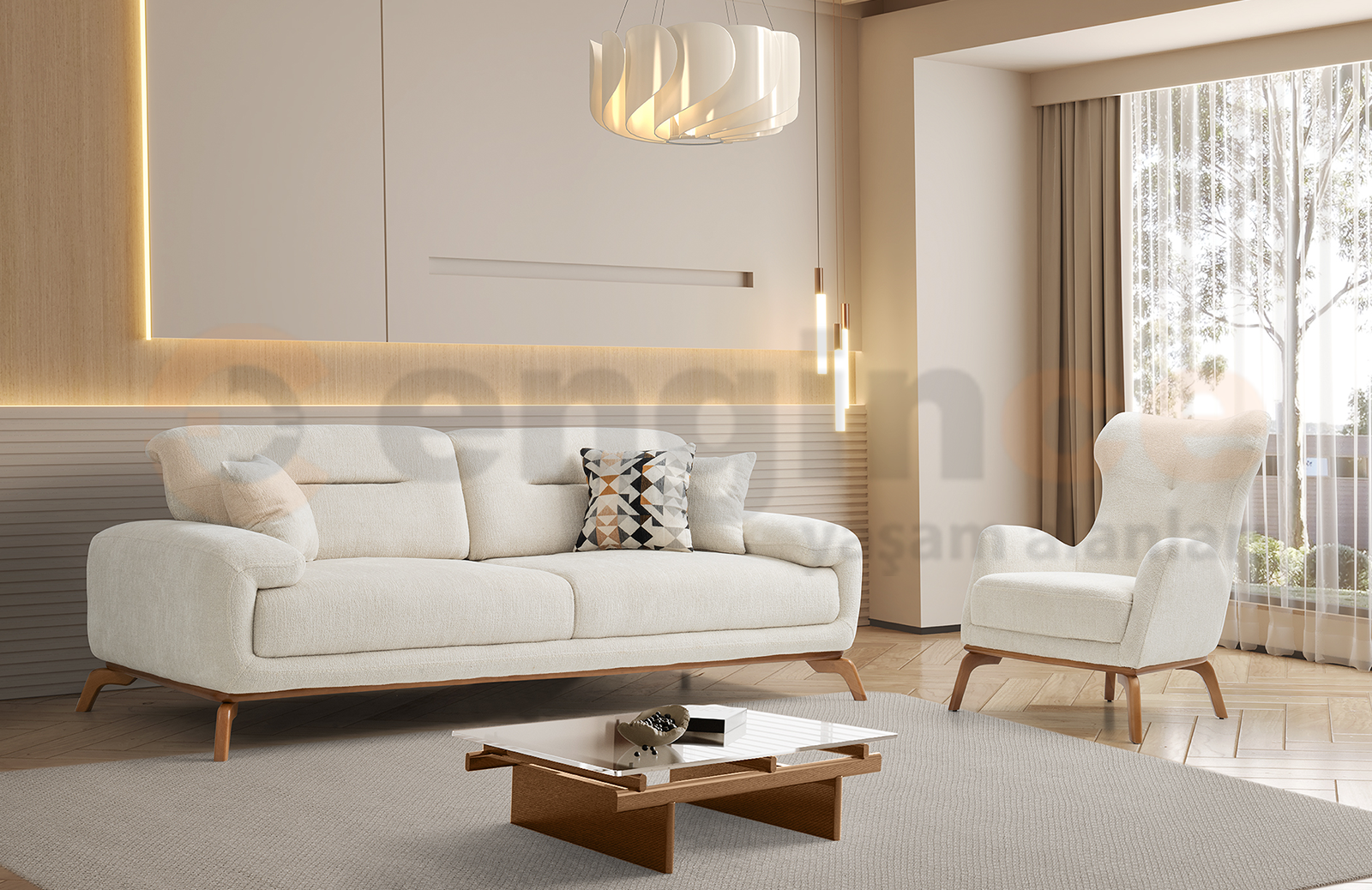 Loring koltuk takımı, modern ve şık tasarımıyla oturma odalarına zarif bir dokunuş katıyor. Yerden yüksek ahşap ayakları, hem estetik hem de fonksiyonel açıdan mükemmel bir uyum sağlıyor. Takım, farklı ayak renk seçenekleriyle kişisel tercihlere hitap ediyor ve her tarza uyum sağlayacak bir tasarım sunuyor.