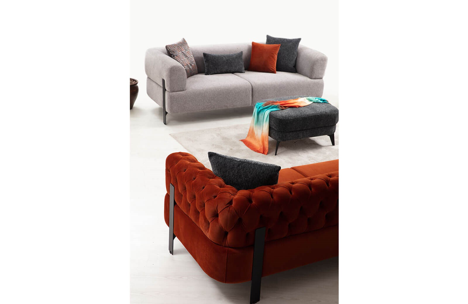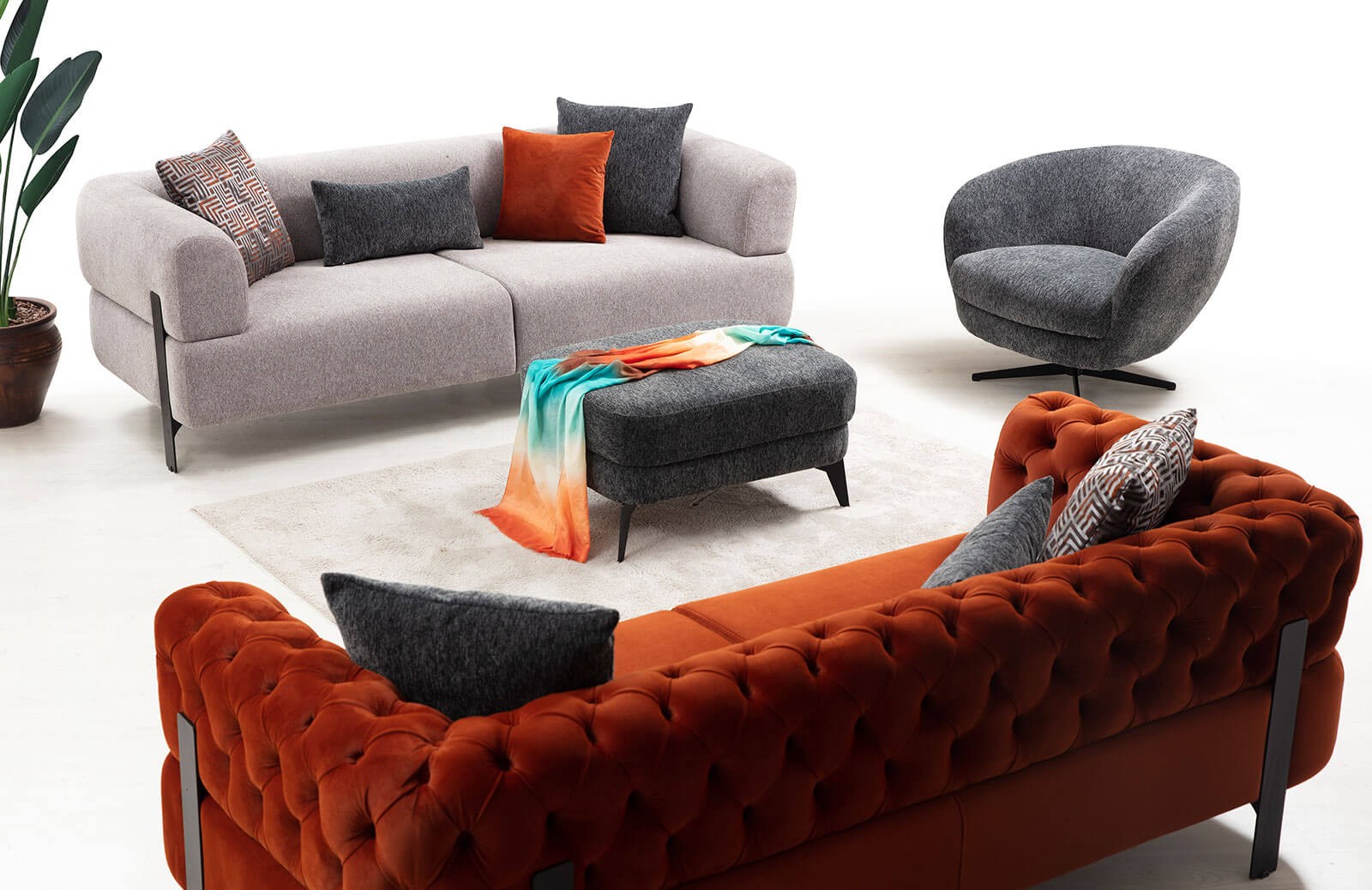 Lotte koltuk takımı, zarif çizgilerin modern detaylar ile taçlandığı özel tasarımlar arasındaki yerini almıştır. Üretimi sırasında her bir malzemenin özenle seçildiği Lotte koltuk takımının fırınlanmış gürgen ağacından üretilen sağlam bir gövdesi vardır. 2 adet üçlü koltuk ve 1 adet berjerden oluşur. Üçlü koltuklardan biri kapitonelidir. Birinci sınıf kadife ve keten kumaşı, hızlı yıpranmalar karşısında dayanıklıdır. Su ve beyaz sabun yardımı ile kolayca silinebilir olup, kuru temizleme için uygun değildir. Döner berjeri, bireysel bir konfor alanı sunar. Oturum minderi ise 32 dns hr sünger ile kaplanır ve yay içermez. Böylece uzun seneler ev dekorasyonunuza eşlik eder. Ürünün ayak rengi değiştirilebilmektedir. Ekstra kırlent seçimi yapabilir, aynı zamanda zengin kumaş ve renk seçeneklerinden yararlanabilirsiniz. Lotte koltuk takımını evinize uygun özel ölçülerde sipariş vermeniz mümkündür.