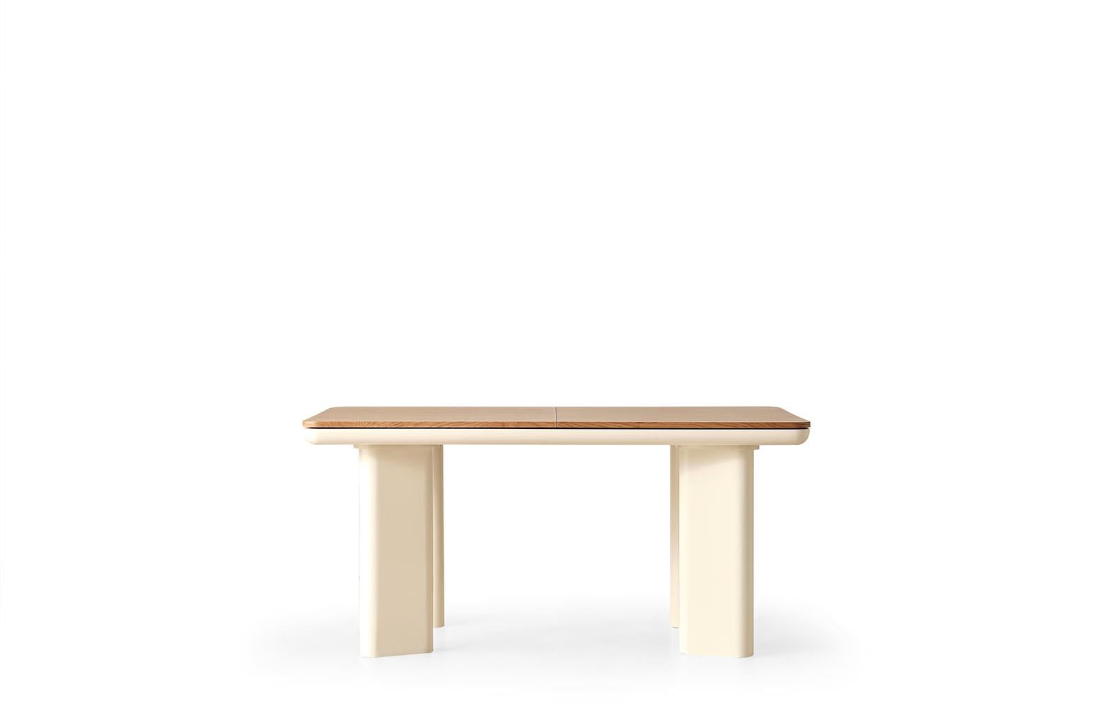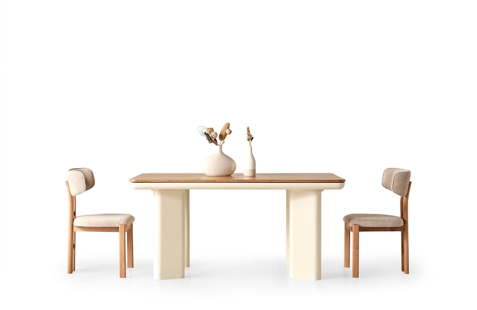 Ekru rengindeki Melos Yemek Odası Takımı, açık ceviz ve ekru tonlarının uyumuyla modern bir görünüm sunuyor. Göz alıcı bir yemek odası dekorasyonu yaratmak isteyenler için tasarlanan takım, sadeliğiyle ön plana çıkarken, robot süpürge uyumluluğuyla da günlük yaşamı kolaylaştırıyor. Salon yemek masası takımı olarak tercih edilen bu model, farklı tarzlarda dekorasyona kolayca uyum sağlıyor.