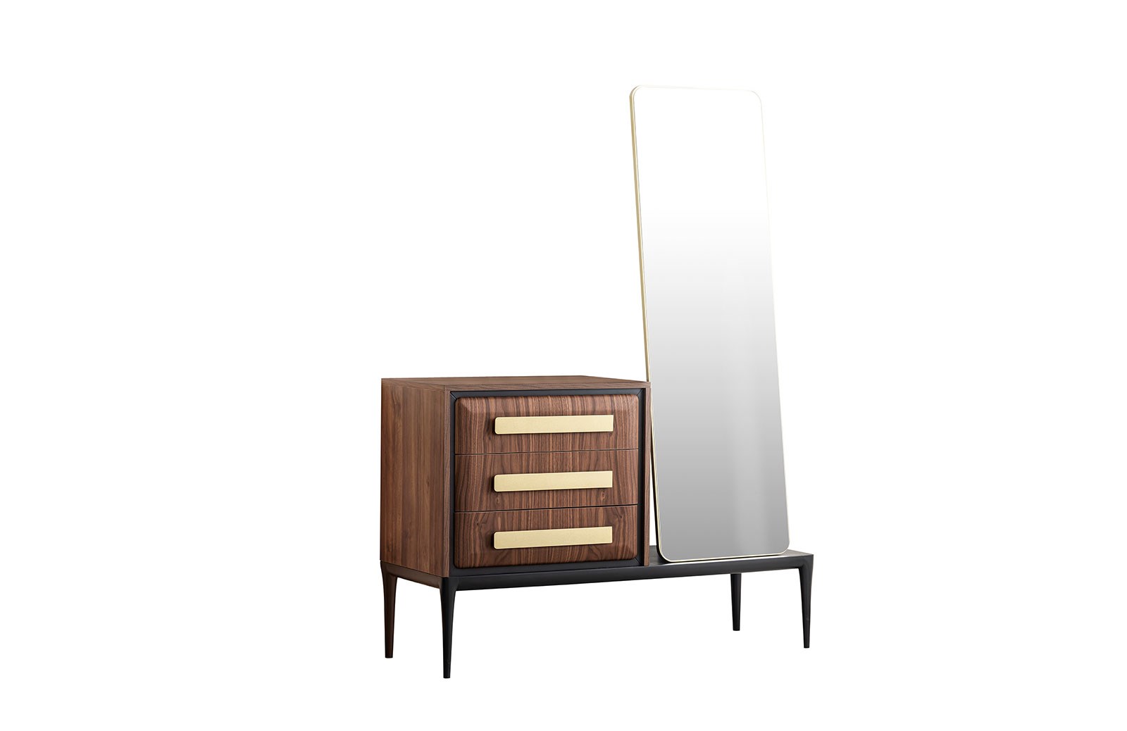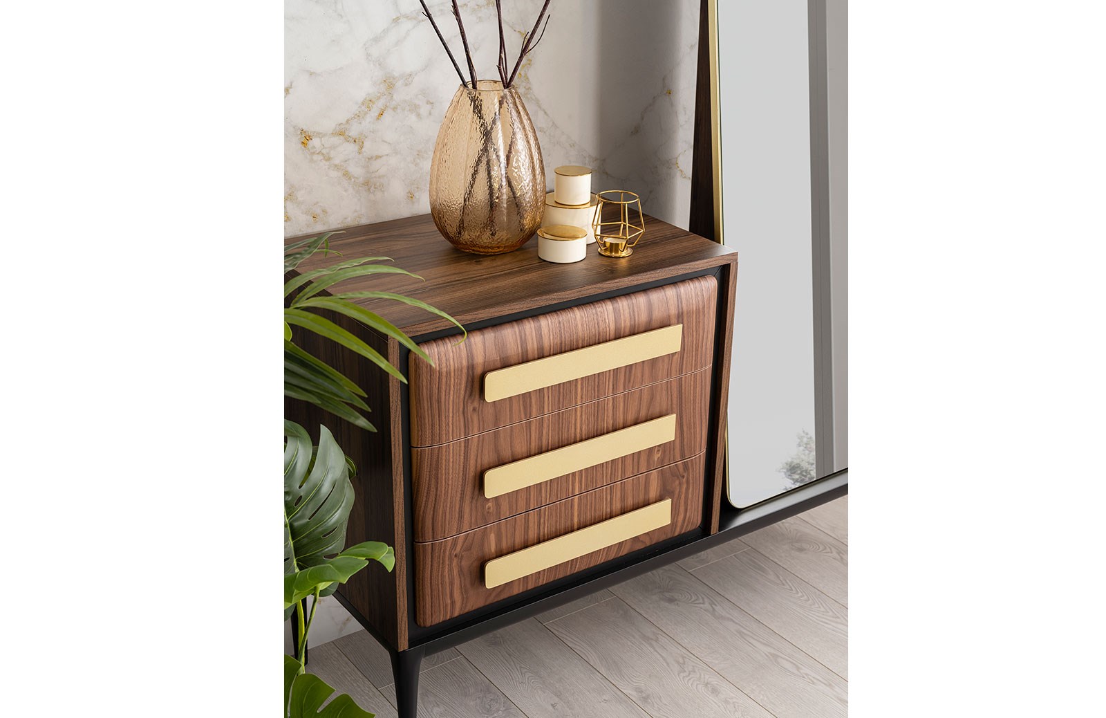 Morris yatak odası takımı, karakteristik ve şık bir yatak odasına sahip olmak isteyenlere hitap eden özel bir tasarımdır. Geniş bir kullanım alanı sunan Morris yatak odası takımı; bazalı karyola, kapaklı dolap, 2 adet komodin ve şifonyerden oluşmaktadır. Farklı kombinasyon seçeneklerine sahip olan takımın yatak başlık rengini değiştirebilirsiniz. Geniş bir depolama alanı sunan bazalı karyolada güvenlik için bariyerli kilitli baza sistemi bulunmaktadır. Dolabın askılık kısmı ise led ile ışıklandırılmıştır. İmalatında yer alan her malzeme kalite standartlarında olup, mdf üzeri ceviz kaplamadan üretilir. Özel ölçü siparişi ile sahip olabileceğiniz Morris yatak odası takımı, modern ve işlevsel bir yaşam alanı için tercih edilebilecek en ideal mobilyalar arasındadır.
