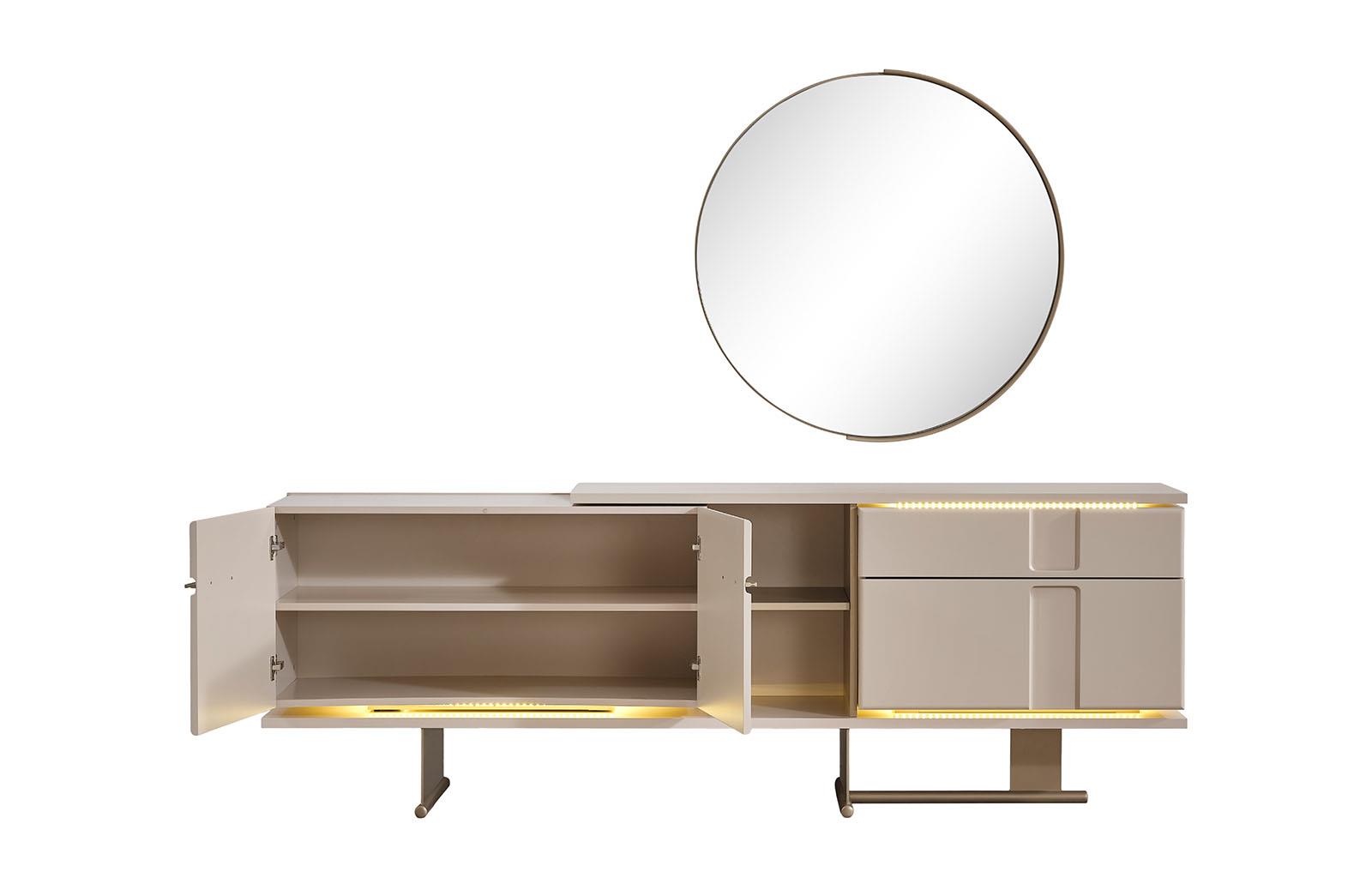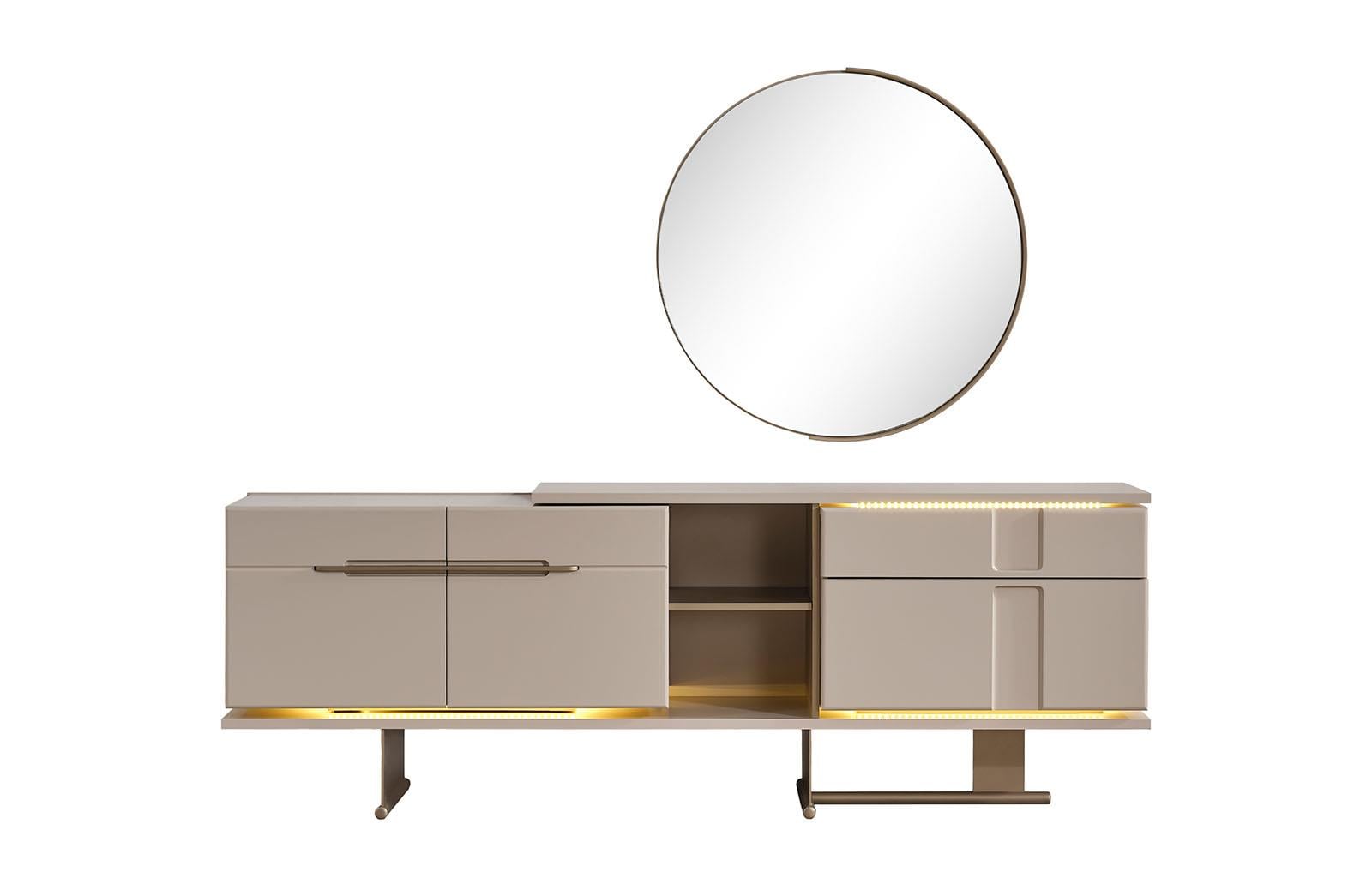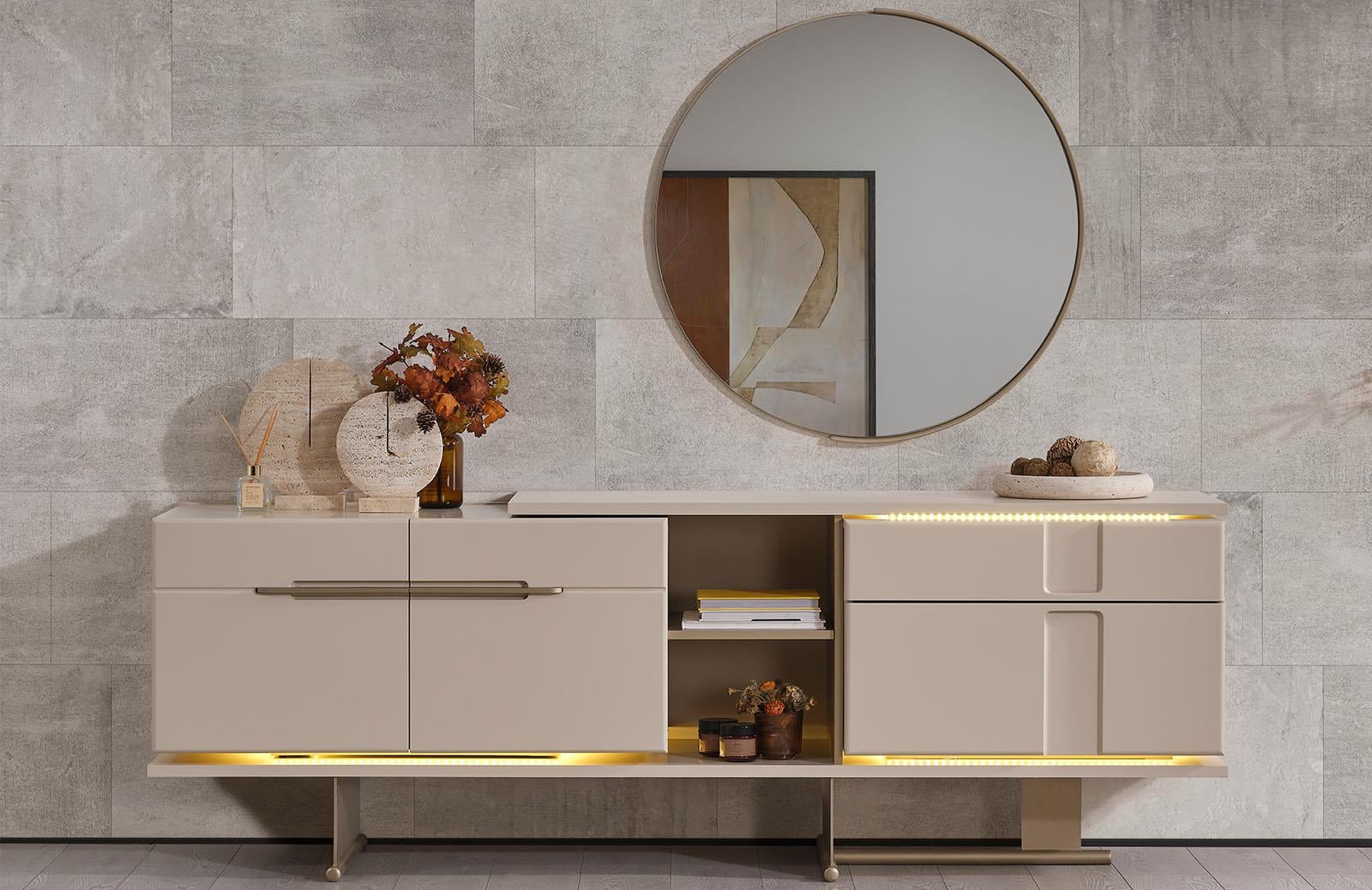 Noa Konsol, modern tasarımı ve zarif vizon rengiyle her mekanın şıklığını artıran bir üründür. İç kısmında bulunan LED aydınlatma, konsolun estetik görünümünü güçlendirirken, mekana sıcak bir atmosfer de katmaktadır. Özel ölçü seçeneği ile farklı alanlara uyum sağlayabilen Noa Konsol, kullanıcıların ihtiyaçlarına göre özelleştirilebilir. Şıklığı ve fonksiyonelliği bir arada sunan bu konsol, ev veya ofis dekorasyonuna modern bir dokunuş eklemek isteyenler için ideal bir tercihtir.