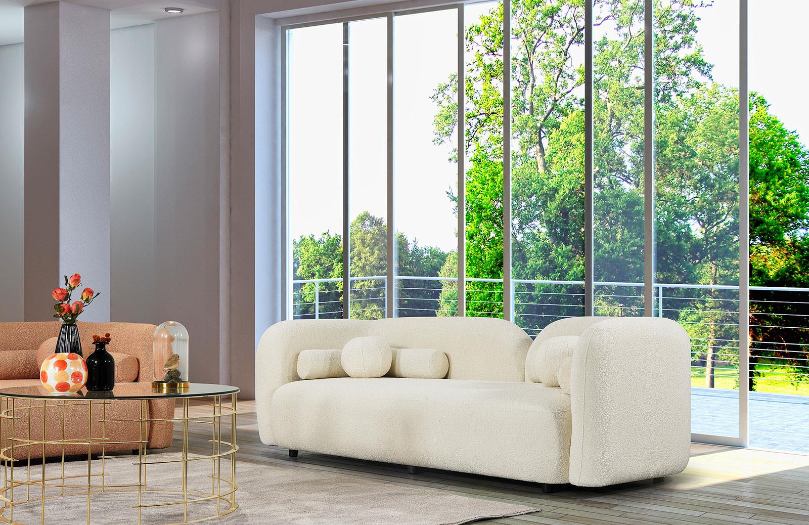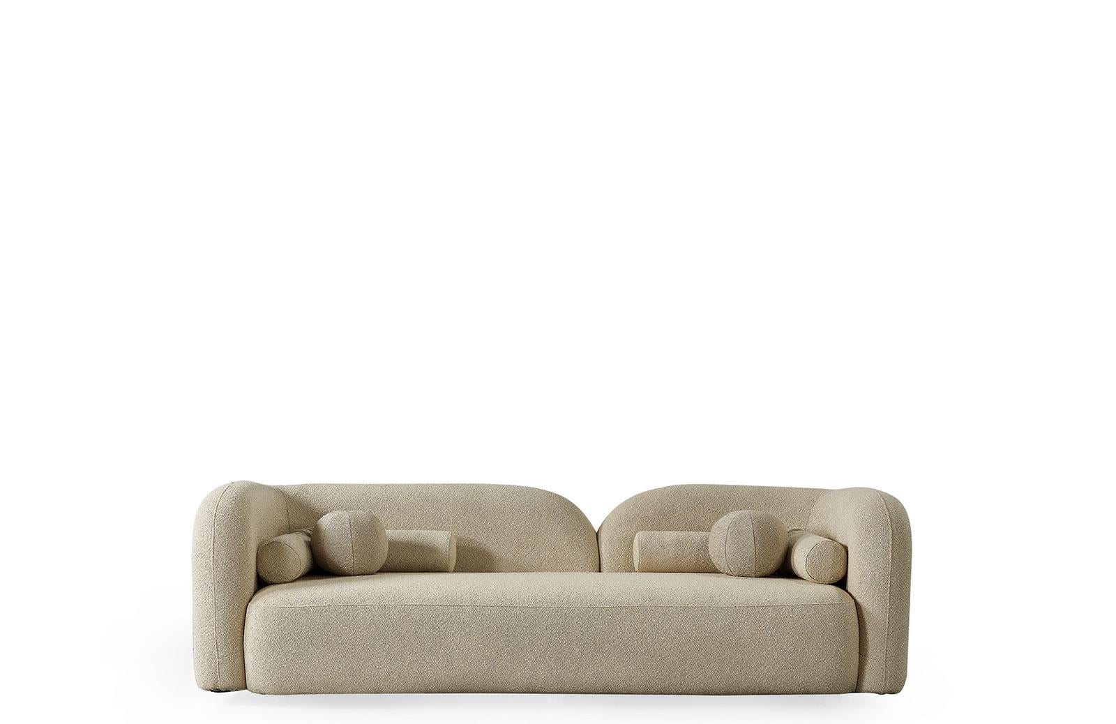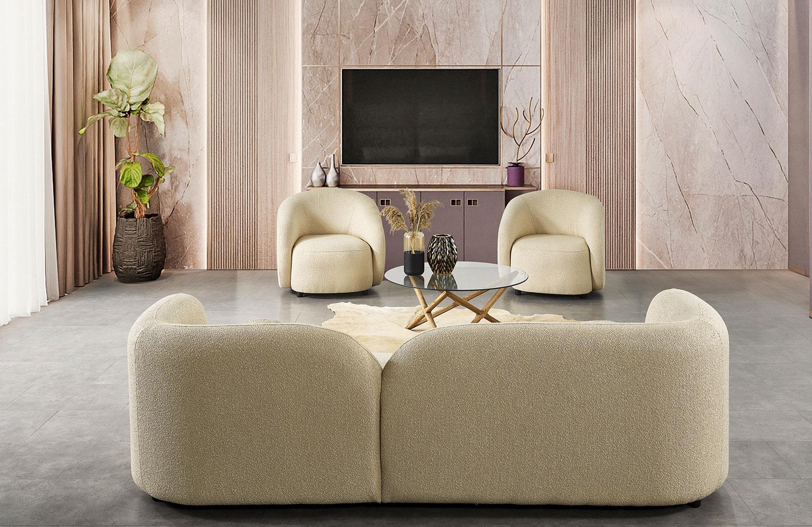 Modern tasarımıyla dikkat çeken oturma odası takımı, konforlu oturum yapısıyla evinize şıklık katıyor. Bukle kumaş seçeneği ile hem estetik hem de dayanıklı bir kullanım sunmaktadır.