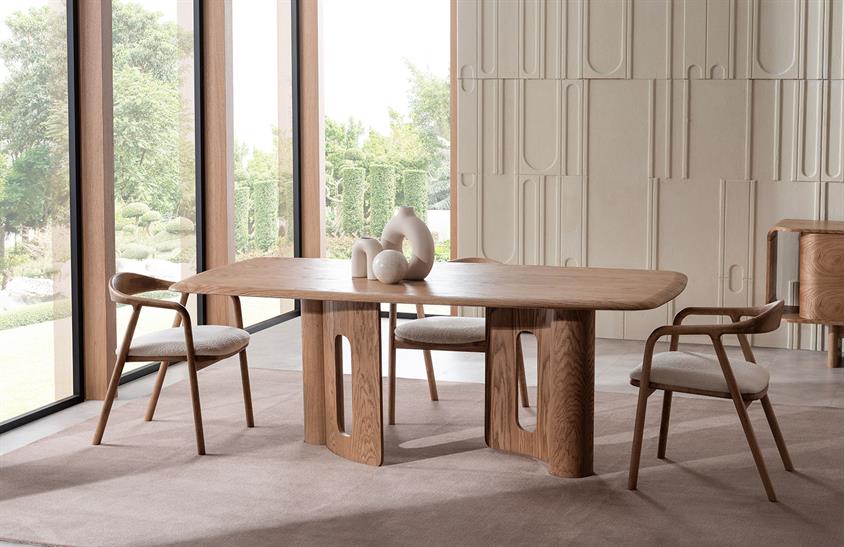 Ramoz Yemek Odası Takımı, modern ve şık tasarımıyla dikkat çeken bir ürün. Takımın genelinde MDF üzerine meşe kaplama kullanılarak hem dayanıklılık hem de estetik bir görünüm elde edilmiş. Hareli meşe deseninin sıcaklığı, takımın modern çizgilerini yumuşatarak evlerinize davetkar bir atmosfer katıyor. Dokuma kumaş seçenekleriyle kişiselleştirilebilen takım, farklı renk ve desenlerle kombinlenerek evinizin dekorasyonuna uyum sağlayabilir. MDF üzerine meşe kaplama malzemesi, takımın uzun ömürlü olmasını sağlarken aynı zamanda kolay temizlenebilir bir yüzey sunuyor.