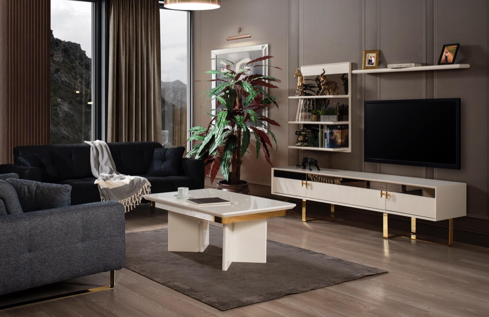 Rudi tv ünitesi, tasarımı ve kalitesi ile uzun yıllar evinizin en özel mobilyalarından biri olacak. Rudi tv ünitesinin takım içeriğinde tv alt blok, üst raf ve üst blok bulunmaktadır. Gövde ve raf malzemesinde mdf kullanılmıştır. Çekmecelerinin dış kısmı mdf, iç kısmı ise yonga levhadır. Ayak tipi yerden yüksek olacak şekilde üretilen tv ünitesinin ayak malzemesi metaldir. Kanserojen madde içermeyen ve kalite standartlarına uygun olarak üretilen ünitede beyaz renk kullanılmıştır. Rudi tv ünitesini evinize uygun farklı kombinasyonlarla satın almanız mümkündür.