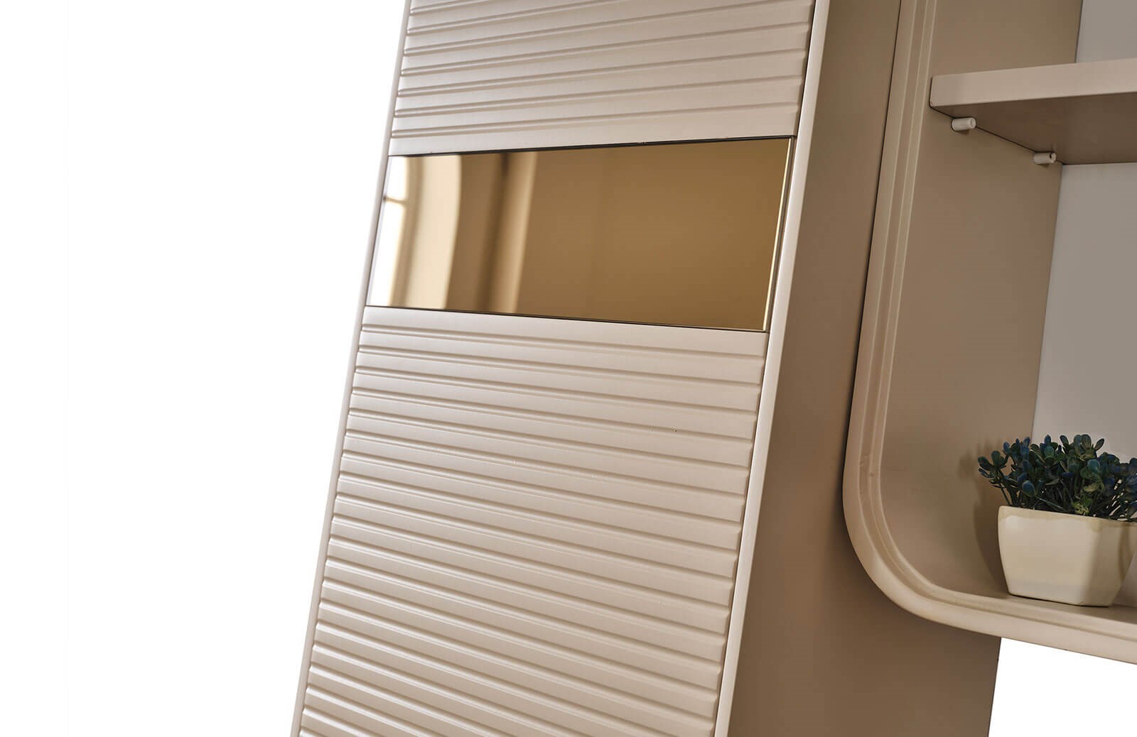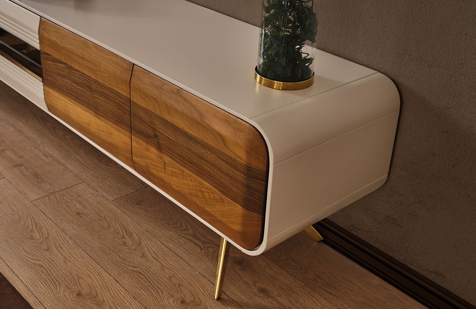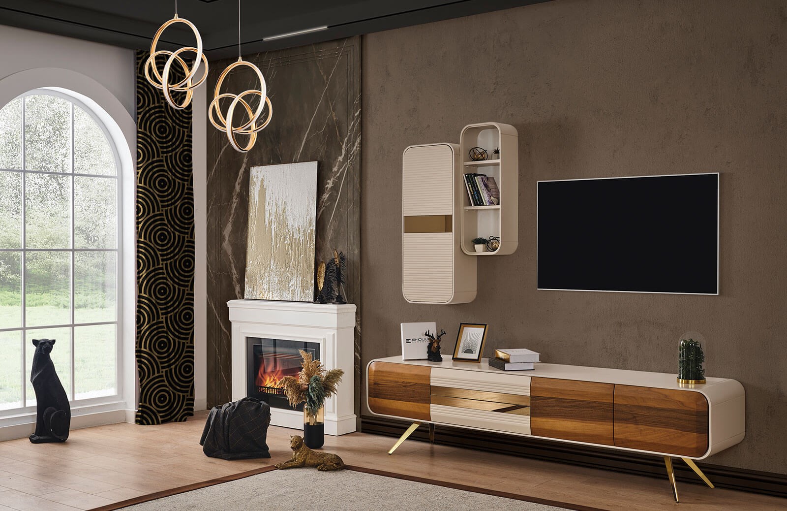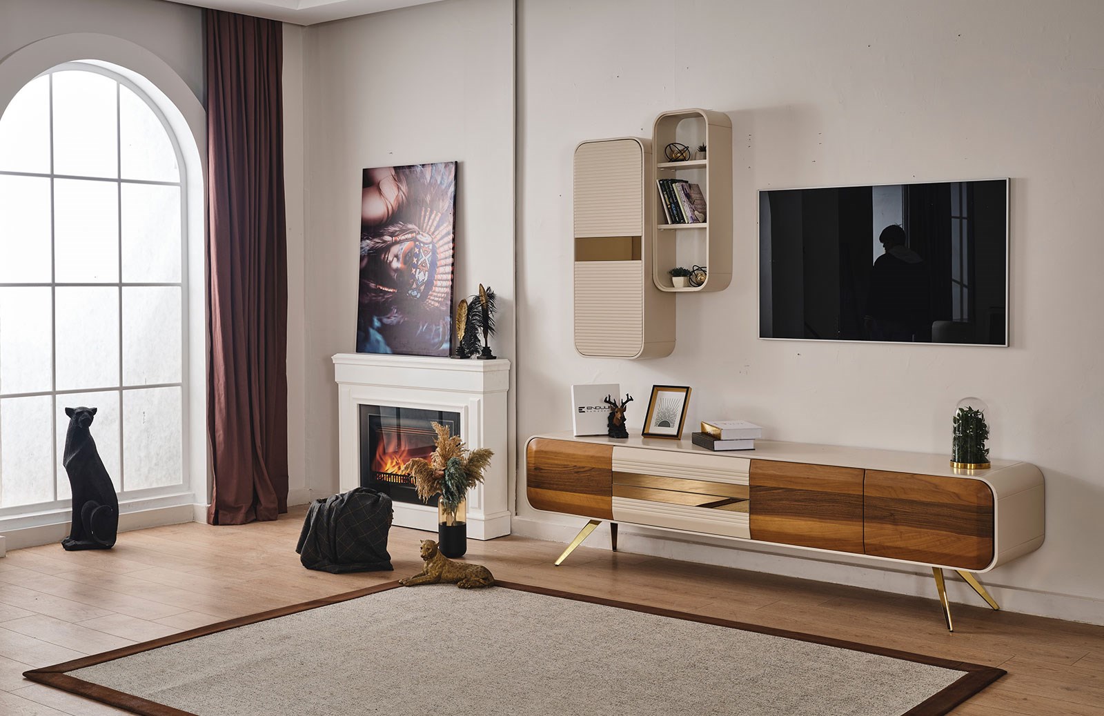Ceviz ve vizon renginin benzersiz uyumunu gözler önüne seren Samwel tv ünitesi ile salon dekorasyonunuza yeni bir enerji, ışıltılı bir görünüm dahil edebilirsiniz. Tv sehpası, üst dolaplı blok ve üst raflı bloktan oluşan Samwel tv ünitesi, fonksiyonel özellikleri sayesinde ihtiyaçlarınıza cevap bulabileceğiniz özel bir tasarımdır. Özel ölçülerde sipariş verebileceğiniz bu şık mobilya, yerden yüksek ayak tipine sahiptir. Ayaklarında metal malzeme kullanılmak olup, gold rengin göz alıcı etkisi ile tamamlanmıştır. İmalatı sırasında sağlığa ve çevreye zararlı hiçbir maddenin kullanılmadığı ürünün ön yüzleri boyalı mdf, iç yüzeyleri ise yonga levhadır. Tüm kapaklarda yavaşlatı mekanizma kullanılarak, takımın uzun ömürlü yapısı korunur. Samwel tv ünitesinin ışıltılı enerjisi ile dikkat çekici bir salon dekorasyonu gerçekleştirebilirsiniz.